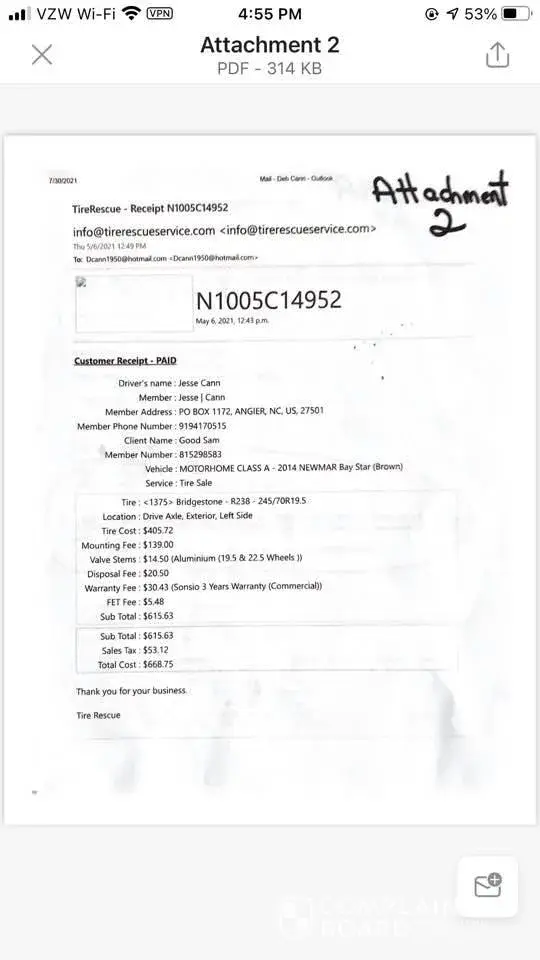 We had a flat tire in Oklahoma City on 5/6/2021 while on an extended road trip. We contacted Good Sam Roadside Assistance and they came out and replaced our tire. We paid for the tire over the phone and were told that we would need to file a claim for reimbursement for the cost of the tire - see Attachment 2.