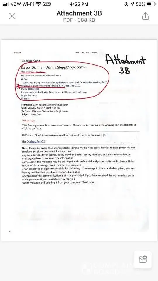 When we called to file the claim, Good Sam informed us that we did not have tire coverage under our Roadside Assistance Plan. We contacted Dianna Stepp, at National General Insurance via email and explained our situation. Dianna was the representative that sold us our Good Sam coverages. She responded to us that we did have tire coverage through our Extended Service Plan - see Attachment 3. Her email to us clearly states that we do have tire coverage. In fact, there are two emails, on two different dates assuring us that we have tire coverage.