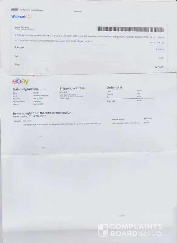 Claimed loss: Parts:A/c Condenser $80.06Parts:A/c Compressor replacement Kit E-450 $270.79Labor: GodSpeed Automotive LLC $293.06