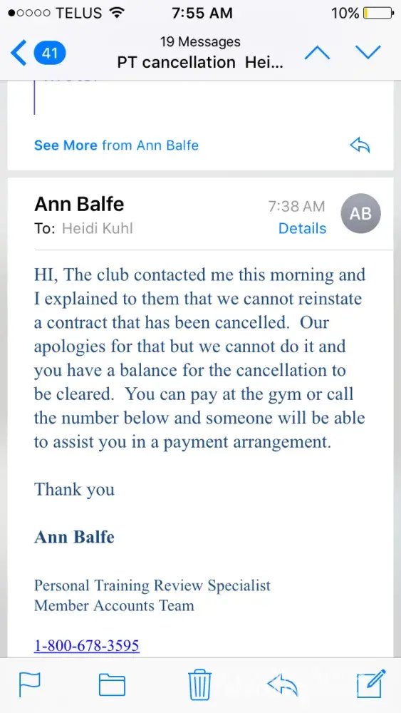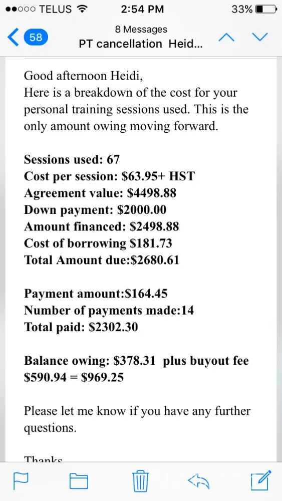 I called head office to ask about cancelling my training contract. I was told previously by my former trainer as to how the process works for cancelling a contract, and he told me (and I trusted him) that it would only be 10% of my REMAINING balance, yet was never informed of what my balance was at the time. When i called head office the representative confirmed this when I asked if the payout would be 10% of the remaining balance again. So again, j was lead to believe that I was only owing a few hundred dollars at most. So I sent in the request for cancellation STILL not being provided the numeric details of my account. I was under the understanding that I had payments due until the end of the year that would total up to at least 1000$. At no point was I told that there was only 3 payments remaining of 167.xx dollars on my training contract prior to requesting this cancellation (which is what I was lead to believe was my best option).