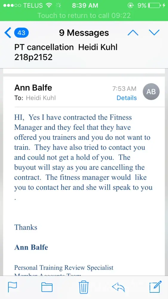 On the following Tuesday, the trainer she offered me (the one who is leaving the country) called and left a voicemail on my phone asking f I would train with him. I was unable to contact the club that day to explain that I had already requested a trainer who would be able to carry out my entire remaining contract.