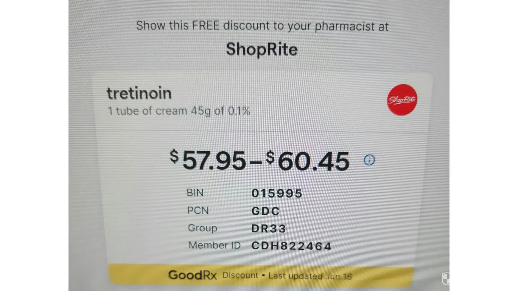 Later on I get call from pharmacy saying that there was misunderstanding on the price of tretinoin and that other person quoted me on different cream. The price she told me was 40% higher than goodrx. I replied that the other person quoted price that matched goodrx min price. After arguing for 7 minutes I hung up. Then contacted Walmart and they confirmed that the price I'll pay is as states on goodrx coupon. It was extremely frustrating to be scammed like this with shoprite pharmacy which I wouldn't expect from such chain!