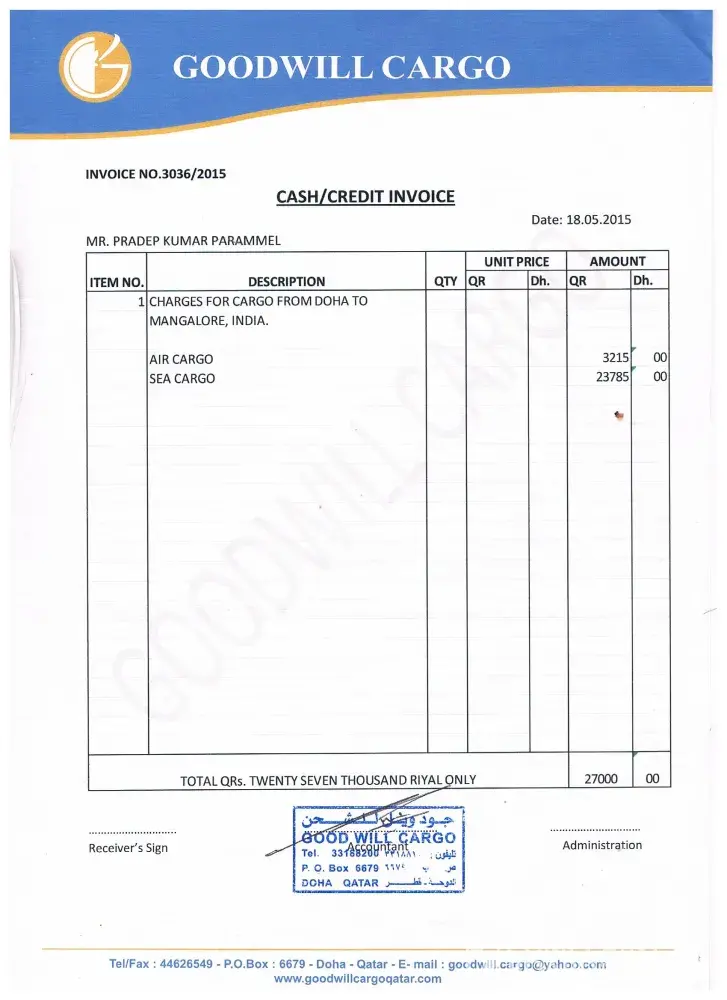 I send 65 cartoon Boxes of house hold items, used electronic gadgets furniture, oven and cloths approximately 2400 Kilo through sea cargo from Qatar with Two wooden boxes measuring 5X5X5 feet volume exclusively for valuable items on 18-05-2015 through Goodwill Cargo to India. Address: GOODWILL CARGO. Mathar Kadeem, Old Airport Road, AL Ahli Bank Building, Doha, QATAR. P.O Box 6679. Tel: [protected] Mob: [protected] Goodwill Cargo sea cargo invoice number 888-6162. I paid 30000 Qatari Riyal (9000 US Dollar) for Door to Door service I received 61 cartoon of cargo in completely damaged condition, my new cooking range oven micro wave oven music sets are complete damaged. Goodwill Cargo did not send cargo in wooden boxes. Two set of ward robs, chest drawer, dressing table, computer table dining chairs all teak wood items bed mattress are broken and unused condition. send 100 damaged goods picture Total worth of damaged goods is 46000 Qatari Riyal (12600 US dollar) Still I have to get 4 more boxes cartoons of goods since six months. Since six months I tried to contact Goodwilll Cargo official in vain. Goodwill cargo avoiding my call from India and neither responding nor replying my mail. In the month of July 2015 they promised to send investigation team to my residence in India. Since six month I spend 6000 Qatari riyal (1500 US dollar) for telephone. I lived in Qatar 24 years. My residence permit number was [protected]. My email [protected]@yahoo.com