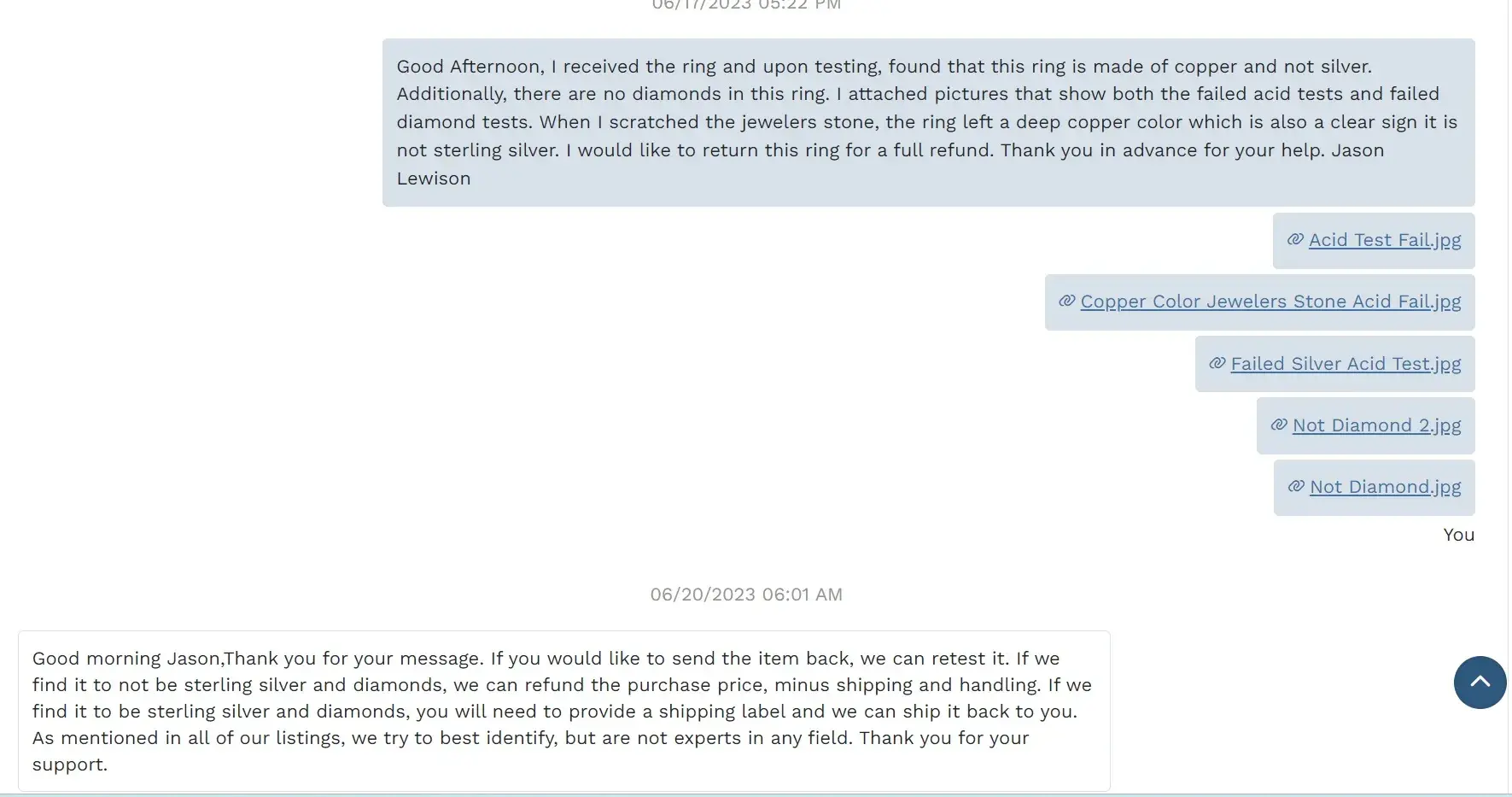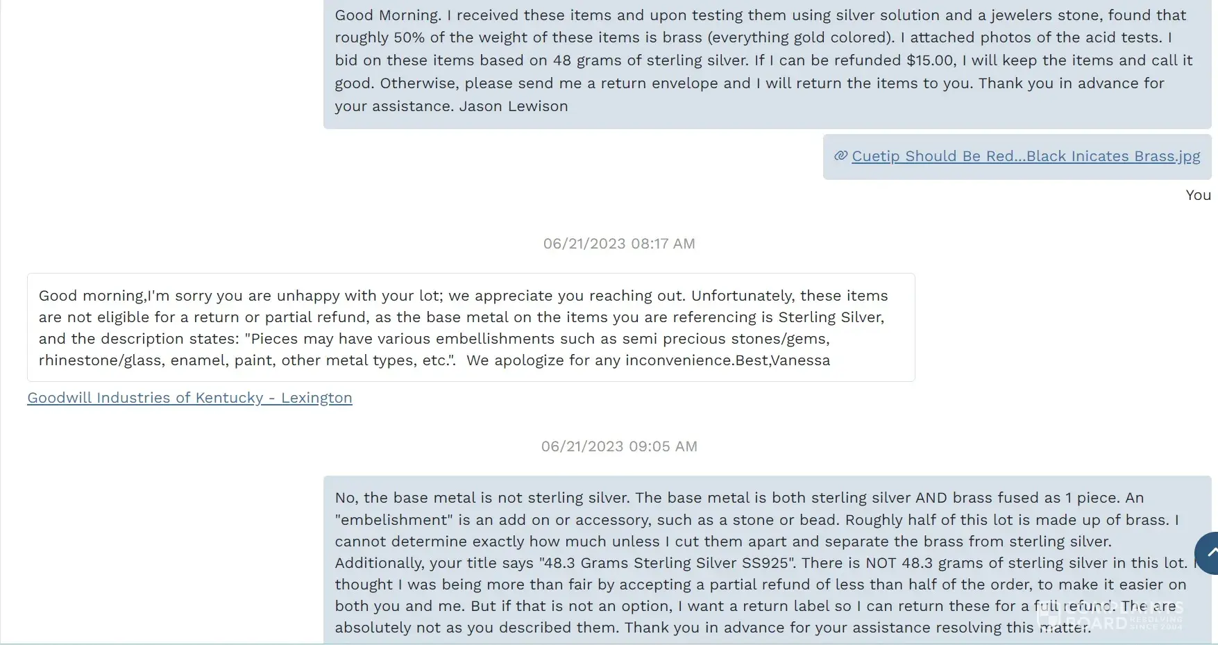 My complaint is against the Goodwill store - Goodwill Industries of Kentucky - Lexington. They sold me a jewelry lot they listed and described as "48.3 Grams Sterling Silver SS925 Mexico Wearable Bracelet & Brooches Pins". Upon further inspection and testing, I found that roughly half of the jewelry is made of brass and copper, and is not 48.3 grams of sterling silver as they listed. I understand that mistakes happen so I informed the store of my findings and sent them proof of my testing. I requested a partial refund or a return label to send the jewelry back to them for a full refund. I was shocked to see their employee Vanessa reject my return request completely, regardless of the evidence I presented. They committed blatant fraud and aren't even trying to hide it. They are trying to say the jewelry brass/copper is an embellishment, like a gemstone. Their policy states jewelry may contain embellishments. However, as can be clearly seen in the attached pictures, the jewelry is made with mixed metals. The brass/copper and sterling silver are all fused together as one piece and was not an addition. Even their manager was absolutely no help as he concurred with Vanessa's communications with me. They flat out rejected all return options and then disabled/blocked my account from further purchases. I have been a loyal Goodwill customer for decades and have purchased hundreds of products through them. Buyers BEWARE of this store! They will tell you they are selling you something desirable and will ship you a turd!