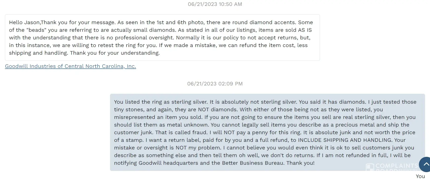 The Goodwill store in Greensboro, NC sold me a ring they said was sterling silver with diamond accents. I paid to have the ring sent to me in North Dakota. When the ring arrived, I tested the ring and it is junk costume jewelry, made of copper and there are no diamonds in the ring. When I notified the store of their error and sent them the proof of the tests, showing their ring is not what they said it was, they told me I could pay to ship the ring back to them (second time paying for shipping) and they would retest the ring (why didn't they test it prior to selling it). If the ring was found to not be sterling silver, they would refund my purchase price, but not the shipping and handling fees. When I told them that is absurd that I should pay anything for the junk they shipped me, they disabled my account. Can you imagine that? They commit fraud and then double down on it and then tell the customer they have to pay for that junk, even though they lied from the start. I tried to contact them through the website and tried to reach their management. They were NO help whatsoever. This store is HORRIBLE! Do NOT trust them and do NOT buy anything from them. They run the store like used car salesman! Every employee at that store should be FIRED! To be clear, my complaint is not with Goodwill as a whole. It is specifically the Goodwill store in Greensboro, North Carolina.