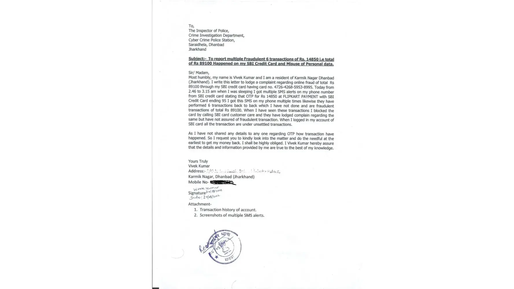 My google account was hacked somehow. On 24/03/2022 morning around 2.30 am to 3.30 am I have seen Gmail(vivek.[protected]@gmail.com) mail read activities which I have not done right now I am using three devices for Gmail one is my Oppof1s and two windows Laptop computer the activities involve my personal data usage which put me in trouble of Rs 89100 someone read my financial data that came from bank i.e OTPs came to my Gmail for a financial transaction I want to track the person who performed these transactions and from where he got my mails to read it is very necessary for me kindly help me. He performed some financial transactions with flipkart using my SBI credit card and buyed some google play coupons and put me in a loss. I kindly request you to track the person who hacked my Gmail details I have also given my complaint to the cybercrime police Dhanbad they are delaying the investigation kindly help me. I am attaching the screenshots of the activity performed