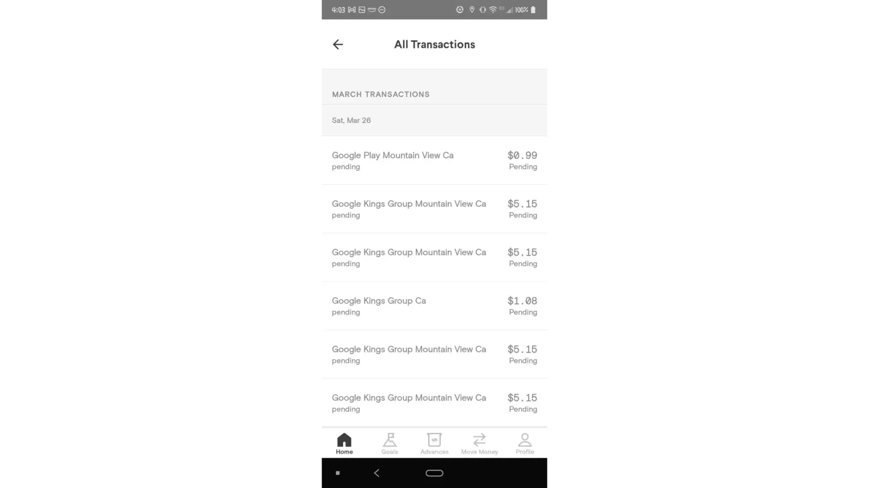On March 25th & 26th I woke up to $.65 in my account. I had 24 transactions for $5.15 and a few $.99 and $1.08 charges and 1 transaction of $.60 Total of $133.86 from Google kingsgroup, mountain view, ca; google play *kingsgroup, mountain view, ca [protected]