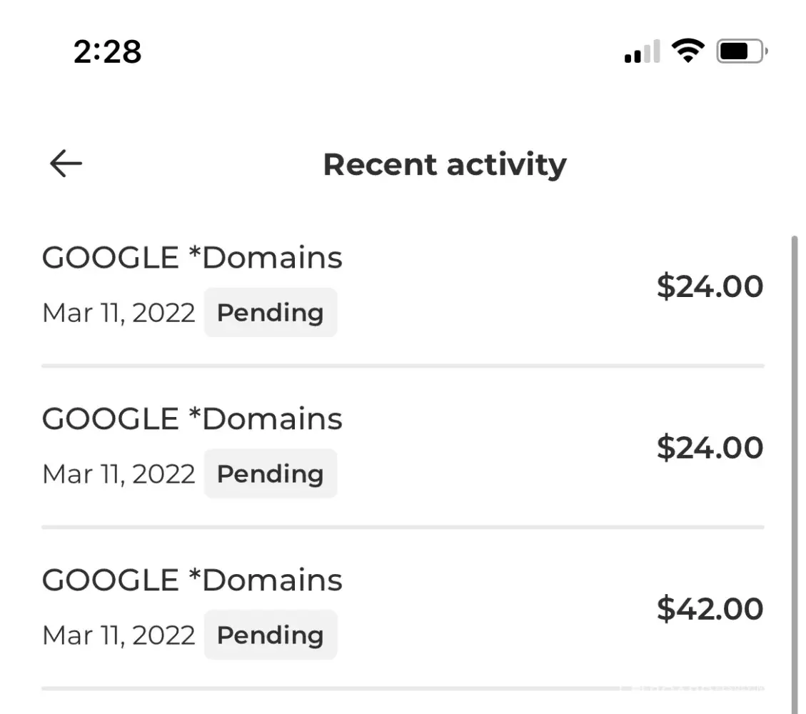 multiple charges, your domain pay page kept giving me errors and to try later. So i tried more than once and it kept giving me the same error message. 5 charges of$42 dollars in my bank account ending 9189, and one charge of of $42, and 2 charges of $24 in my credit card ending 4243. Need urgent help to void and reimburse these over charges.3:04 PMJI understand this is very upsetting.I am willing to check this for you.I'm now checking your account, let me place you on hold for 2-3 minutes. Would that be fine?Jewel · 3:05 PMJust need help resolving it as it put my bank account negative3:05 PMJI understand. We are aware of a problem and are actively working to solve it as soon as possible. We will notify you via email as soon as the issue is resolved. We appreciate your patience.May I have your best email?Jewel · 3:07 PMi understand in solving programing, however, I need immediate reimbursement?financecontrol.[protected]@gmail.com3:07 PMJI do understand that. At this moment I can only say that we will notify you via email as soon as the issue is resolved.Thank you for contacting Google Domains!Jewel left the chat.3:09 PMThank you for contacting Google Domains.Jewel · 3:09 PMThe session has ended