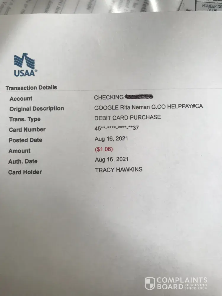 There was a debit card charge of $1.06 that posted to my bank on 8/16/21 with a description of "GOOGLE Rita Neman G.CO HELPPAY#CA".