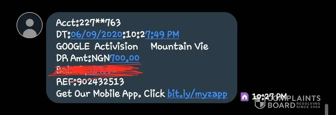 The #700 deducted from me was for google Activision mountain view please I need a refund back as soon as possible. Cause I'm not aware of such transaction for any reason. I was debited from my zenith bank account.