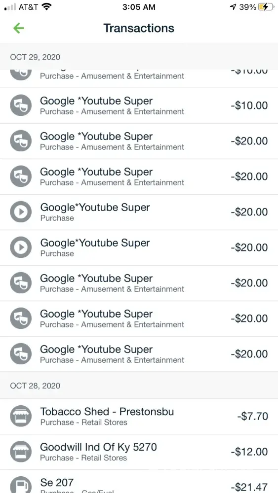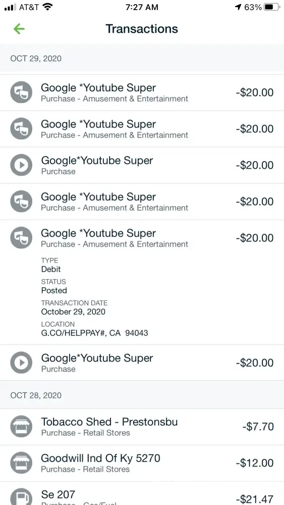 On 10/29/2020 I checked my bank account then app and realized my rent $ of 200$ was fraud entry taken for google *YouTube super I don't have my card linked to google nor do I use YouTube I closed my card and contacted bank I requested refund then google on the 29th still no word back! I never knew how common it was to be fraud by google! Who would've thought!