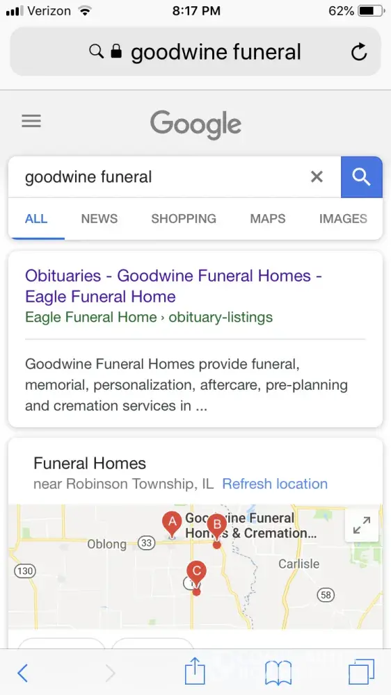 Searching for goodwine funeral home the search comes up with eagle funeral homes on the search. They have no connection with goodwine funeral homes. All other search engines do not have that error only google? If you will search goodwine funeral home on google and other search engines you will see the difference. If you could please correct this error it would greatly be appreciated.