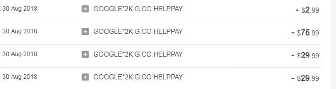 This morning i have checked my online nanking only to find i have 3 chatmrges from googke help pay 2 for £2.99 on 10th august and 1 on the 11th august for £10.99 for google help pay which i hace never heard of my card wasn't present. I wabt the transactions refunded as matter of urgency.