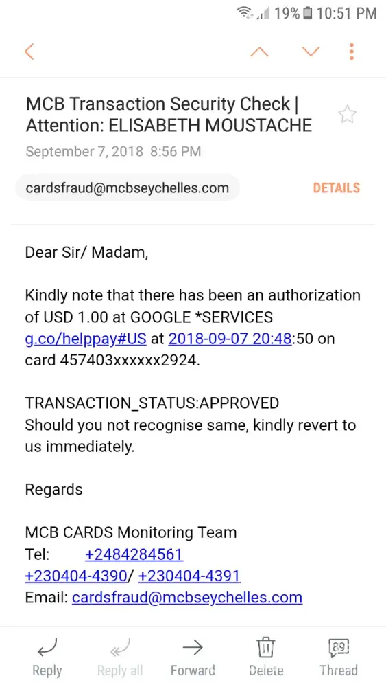 USD 1.00 at GOOGLE *SERVICESÂ Â Â Â Â Â Â Â g.co/helppay#US at [protected]:48:58 on card 457403xxxxxx2924.