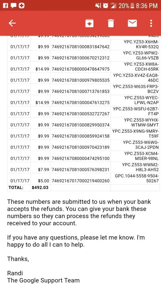 1-17-17 google charged my card $992. Google entered into a contract with me to return these funds. My bank was also on the phone and they say it is VISA policy they can no longer handle the issue once google took it over. 1-21 $492 was refunded to my account. There was ONE charge that was $500 that was never refunded. I called back the 21st and they told me it would show up within the 10 business days. It didn't so i called back. They confirmed again and said it would be 10 days. It has been a 10 day cycle since jan. In may tbey told me they couldnt help bc it had been over 120 days. NOT my fault. They keep telling me to contact my bank and i have told them at least 20 times my bank will not handle it bc visa policy states it is solely googles obligation since they promised to return my funds. Some reps tell me its refunded and check back in 10 days. Some reps tell me they can't refund it. Some reps tell me i cant recieve these funds bc of the time limit. Some reps tell me they can not find it in their system and apologize. I have been hung up on and laughed at. I have been ignored for MONTHS! Idk what to do honestly. I'll include pictures of what my most recent rep sent me. It is confirmation of ONLY $492. I will also include a picture of the one $500 charge. Just that one charge alone is more than all of the refunds google gave me combined. This whole mess is insane. I haven't had a competent representative yet.