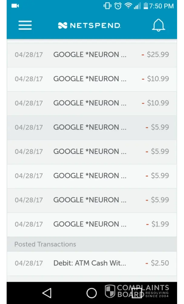 I have been charged 8 times in less in 30 minutes with charges ranging from $1.99 to $25.99 the charges show up on my card as Google neuron I've never heard of it never used it and need a refund please I am on disability and I cannot afford to pay for services I do not use and do not even know they exist please Rectify this situation thank you have included a screenshot of the eight charges on my NetSpend card it only contains the charges that I am questioning I hope this helps I really need that money thank you