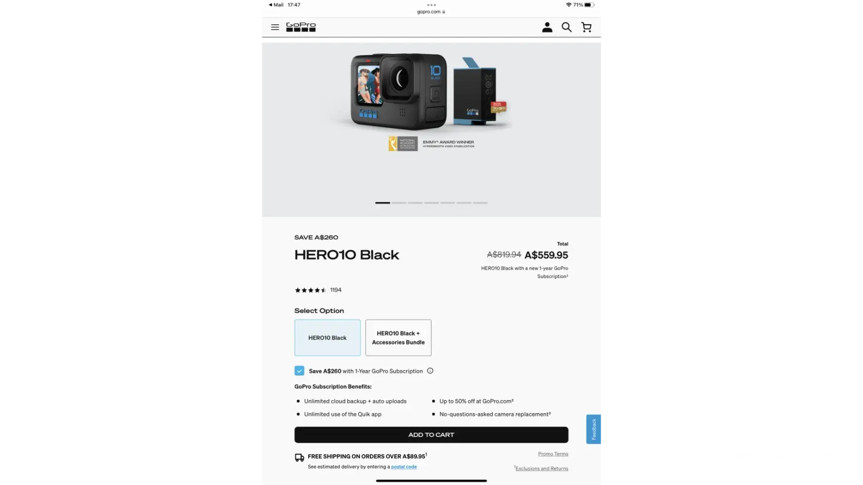 I contacted GoPro customer service and they asked me to send the screenshots to them, which I did, and then he started to give me a whole load of excuses of how mistakes can happen. I explained to him that I understood that and he sent me a 25% discount voucher which actually made the deal more expensive as it took the discount off the original price of A$819.94. He then argued that the 1 year subscription was not included, even though it states that it is included in the sale.