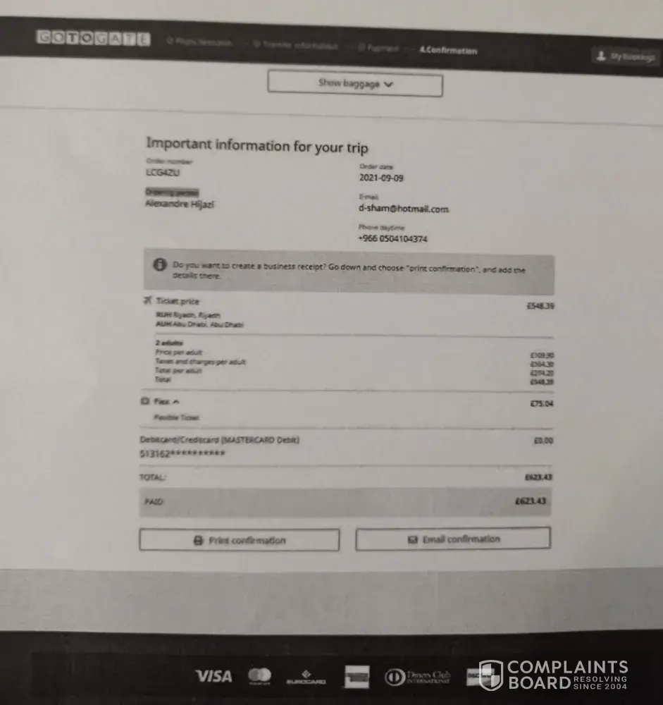 On 23 July 2021 we booked flights from Tenerife Norte (Spain) to Ibiza (Spain) on Vuelling Airlines for three people (Surnames Viljoen, Ferreira & Ferreira) travelling on 27 July 2021. At the time of the booking the screen was just hanging and it never went through to the normal confirmation screen. We left the browser open for long and still nothing happened. Subsequently we tried to retrieve the booking via Gotogate as well as Vuelling with no result. Since Gotogate cover themselves with statements on their site that it could take up to three days for confirmations we did not immediately stress. The payment however went off later on the 23rd and we still did not have any confirmation. We immediately tried phoning their main number "+[protected]" from three different telephone numbers - it just did not work at all. We tried phoning for three days in a row (Today they have a note of their phone troubles on their website which was not there then - see attached). We also sent 4 emails between 23 July and 26 July to "[protected]@gotogate.support". We missed the flight and had to rebook new ones at additional costs elsewhere. The first reply to our emails we got from them was a week later on 2 Aug after our travel date! In the reply they only stated that the confirmation had been sent to our email (not which email) on the day of the booking and if we wanted to cancel we must contact the airline direct! BUT we booked through them!? Furthermore they would charge us a 60% cancellation fee! We immediately asked for proof and details of the email address used for the supposed original confirmation. To this they also only replied a week later! They sent a generic reply on 10 Aug without the detail we asked for. We responded again asking for the detail. They sent the same nonsense reply without the detail on 19 August. We asked details once again and on 25 August they sent the generic reply AGAIN. All replies without the simple question being answered - "what email address was used?"! They clearly can not show where they sent the supposed confirmation to. That makes us think it never existed and they are scamming us. So in summary we paid for flights, tried our utmost to get hold of them through various means, missed our flights, paid for new flights and a month later with four replies from them they were still not able to prove that they have sent any confirmation.