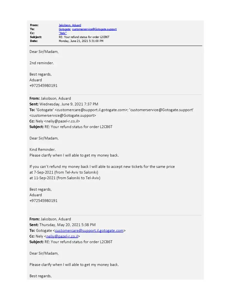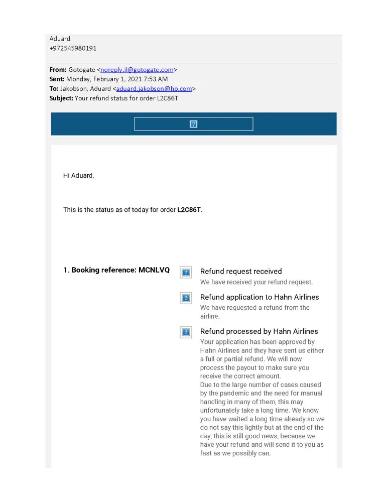 Since February 15th 2021, every time I made a phone call, the GoToGate agents explained that they were still waiting for the airline's payment (last time "Israir"),