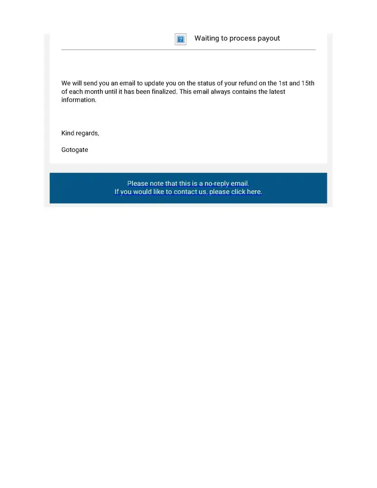 Each 1st and 15th of each month until February 15th GoToGate updated me about a "progress" of my Refund.