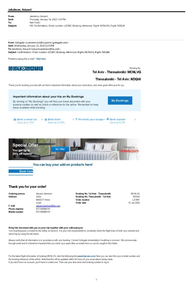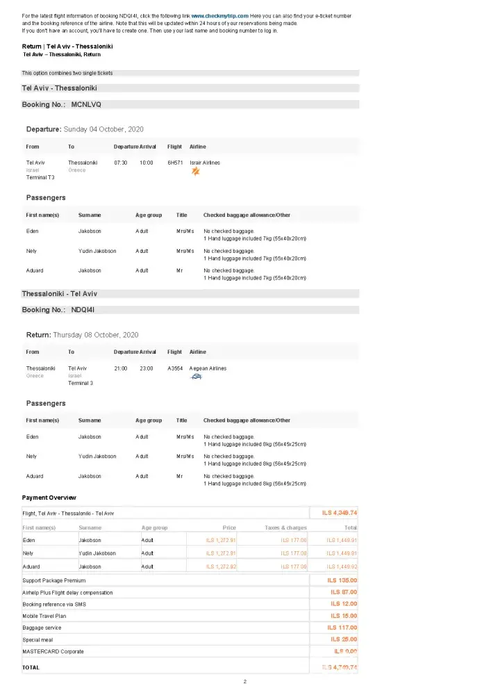 Booking references Flight: NDQI4I - (Thessaloniki - Tel Aviv)