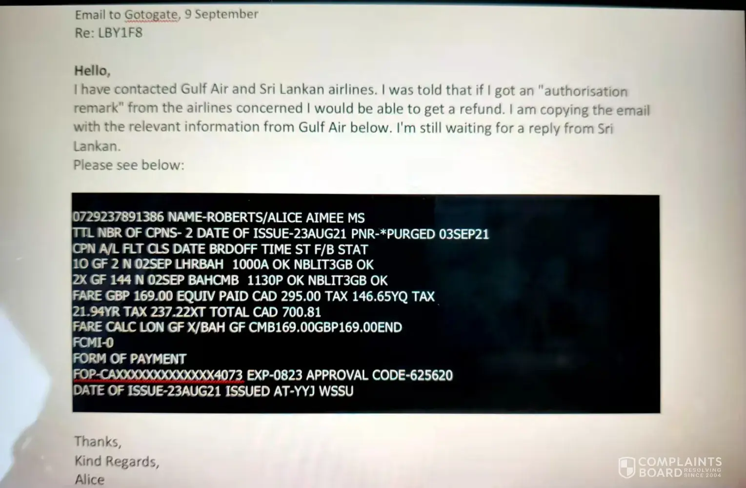 I then called again, and was told I would be able to get a refund (less admin fees) if I obtained an "authorisation remark" from the two airlines concerned (Gulf Air and Sri Lankan). I duly did this (I'm attaching copies of the emails). They said they wouldn't be able to, and that I should contact gotogate again. I was sent back and forth between the airlines and gotogate several times in this way. It seemed I was given different advice each time, which gave me slight hope I might eventually be able to get at least a partial refund.