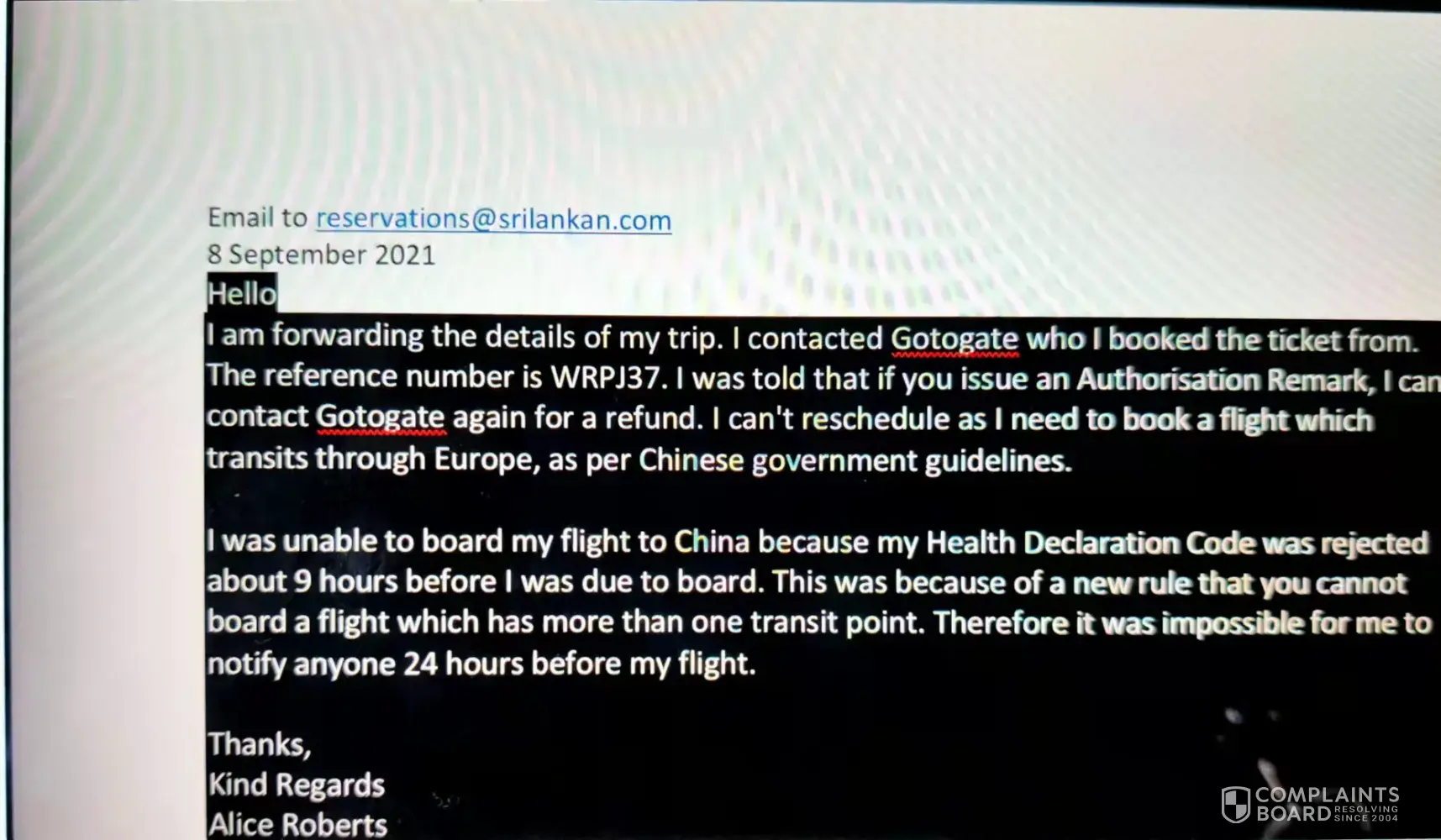 I was due to board a flight on 2 September 2021 from London to Shanghai (transiting at Bahrain, Male and Colombo) which I bought through Gotogate (UK) on 24th August 2021. The cost of the ticket was £1497.71. This ticket was sold as a flexible ticket which could be cancelled and refunded.
