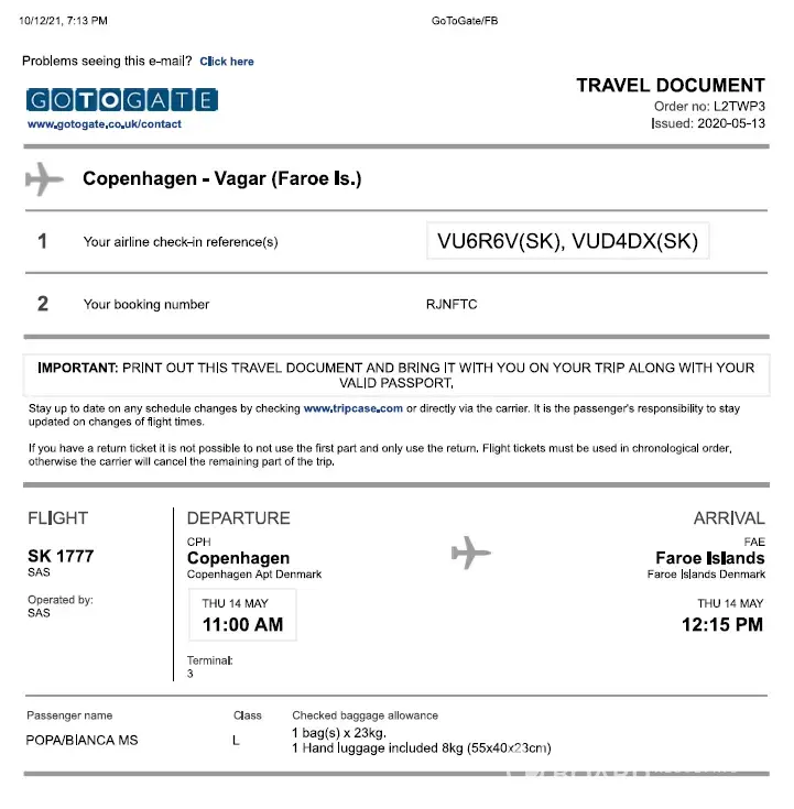 In February 2020 I purchased a plane ticket from Copenhagen-Faroe Islands and return, flight operated by SAS airline. I bought the ticket through the intermediate company Gotogate.