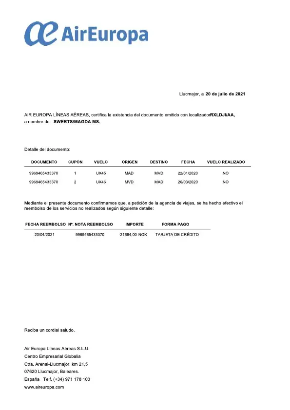 Desired outcome: Transfers my money that you get payed back from AIR EUROPA on 2021 April 23