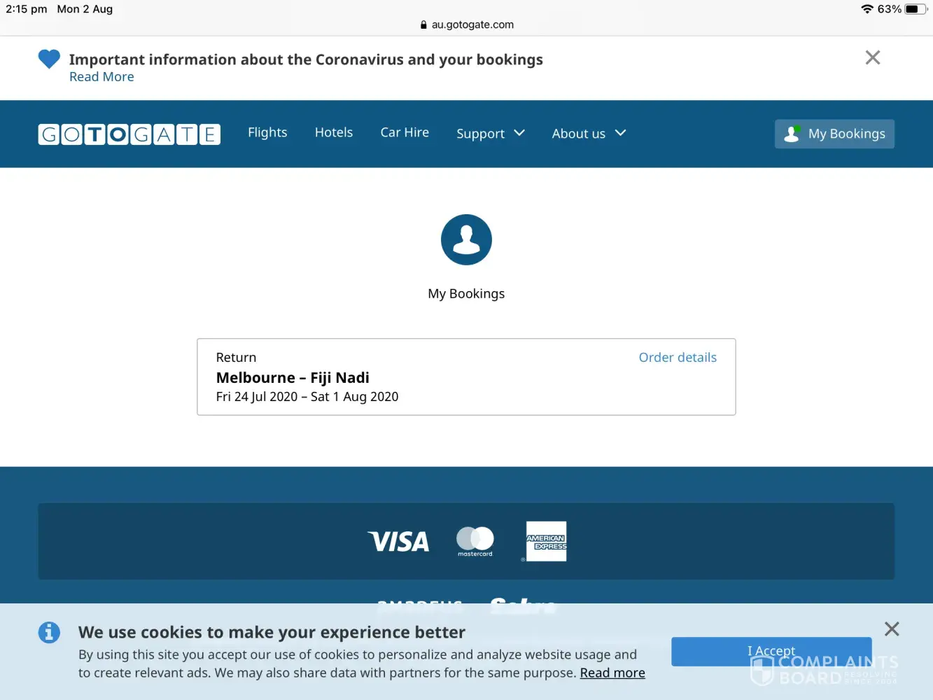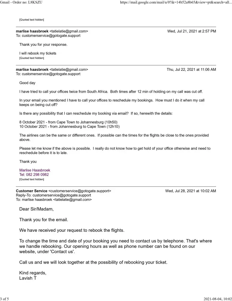 Mijn vlucht werd gecanceld wegens covid. De luchtvaartmaatschappij betaalde gotogate maanden geleden terug, maar gotogate stort het geld niet door. Ik kan hen nergens contacteren : "mijn boeking" herkent mijn reservatie niet, alle telefoonnummers van europa heb ik geprobeerd ofwel zijn ze buiten gebruik ofwel krijg jee een bandje "we helpen u zo dadelijk". Als je mailt krijg je een automatisch antwoord "je boeking is 60 dagen oud en dus geen I info meer beschikbaar"... Het gaat over 2 business vluchten van 4000€ die gotogate schaamteloos achterhoudt. Enige mogelijkheid zal de rechtbank worden. Boek nooit meer met gotogate!