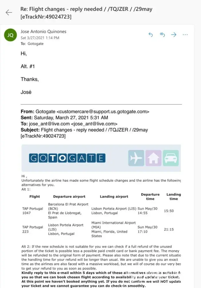 We couldnt travel because Spain was closed to tourism by May 15, 2021, we tried to change the dates or get a refund. The airline says that since we bought the tickets by www.gotogate.com they are the ones that have to gave us options. Its been like a back and forward and still haven't had any options (a refund or alternative tickets). We called and wrote many times.