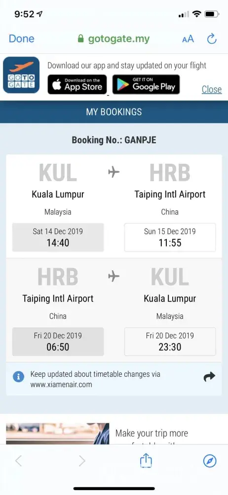 I've book a round trip flight from Kuala Lumpur to Harbin on 14/12/2019 to 20/12/2019.