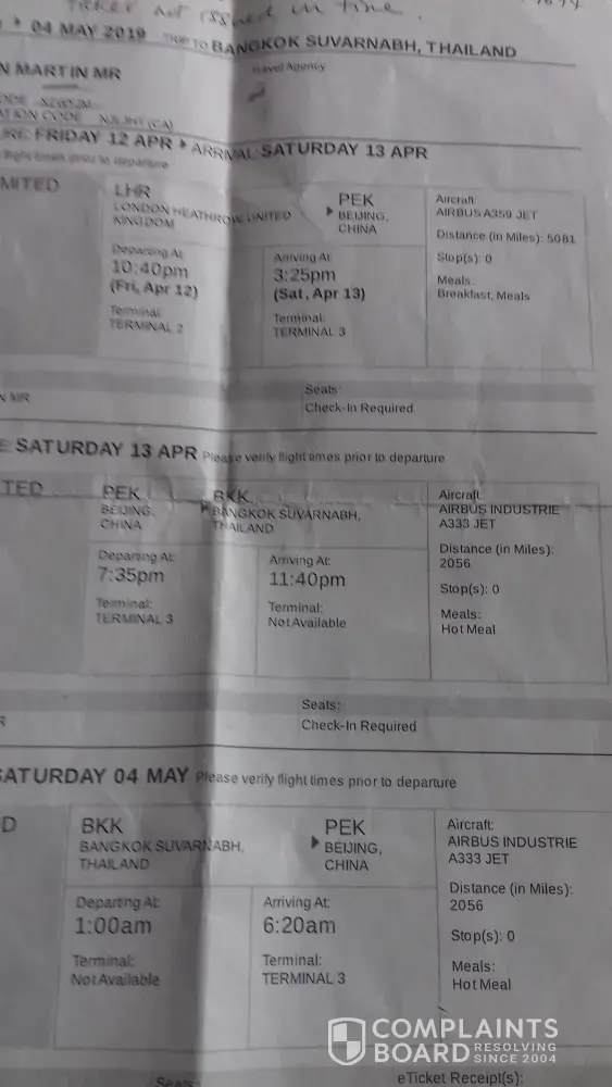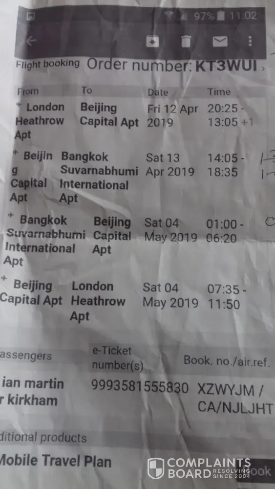 I booked a flight through goto gate on the 17th of January 2019 at 17 55 pm flight booking number was KT3WUI THIS FLIGHT WAS CHANGED SLIGHTLY so I go the new time . And everything was confirmed so I got to Heathrow went to air China desk to find out my flight had been cancelled because goto gate had not booked it in time my self and Mr stewart from air China called goto gate and we was both hung up on it had no alternative but to book a new flight with Thai airways at a cost of £989.02 with resulted in me having less money for my holiday I would like a full refund for both flights my name is Ian Martin Kirkham my phone number is [protected] my email is [protected]@Gmail. Com thank you today's date is 5/5/2019