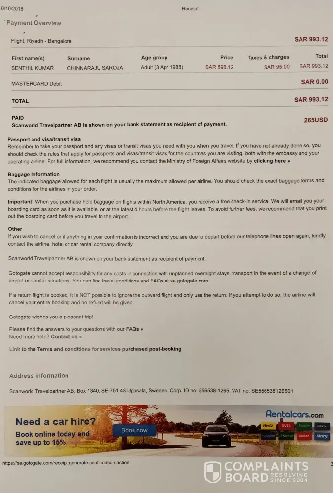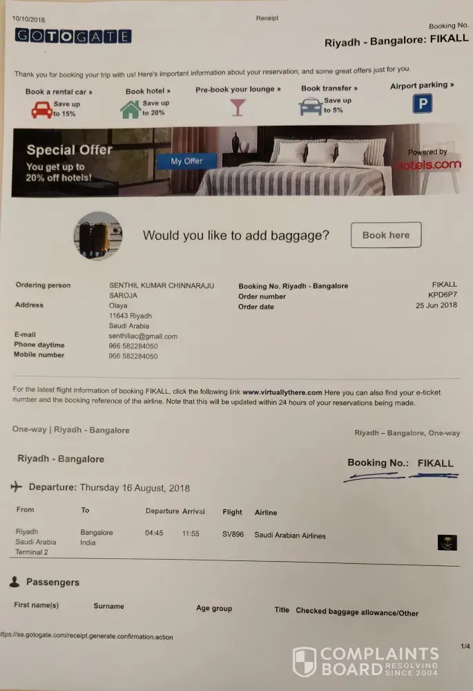 3. I was told by go to gate to purchase another case from blue air for my outbound journey thus incurring more cost even though i had been overcharged by go to gate and that go to gate would investigate how this error and overcharging came about