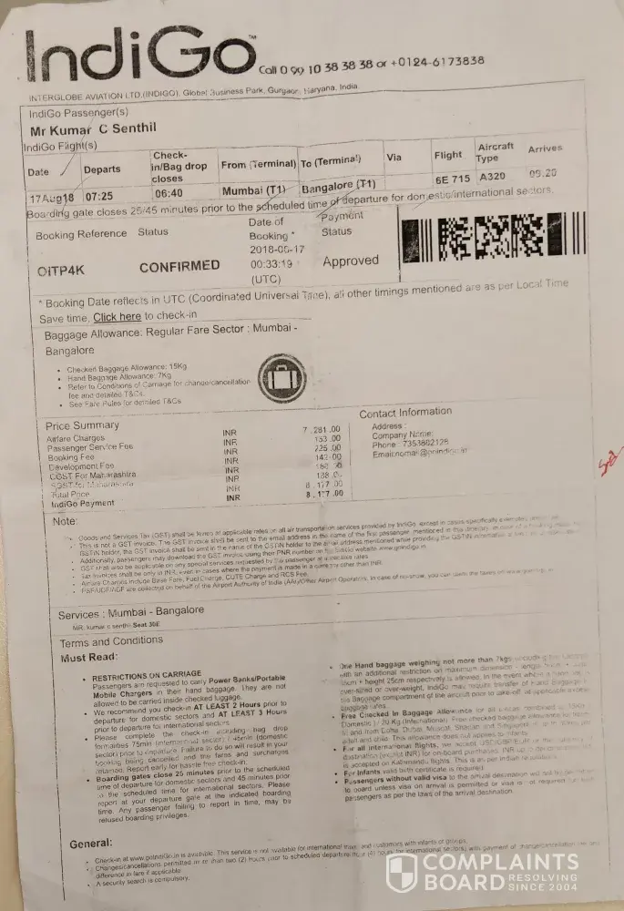 Flight details : 18/09/18 Air India 23.40 hrs DXB to Mumbai