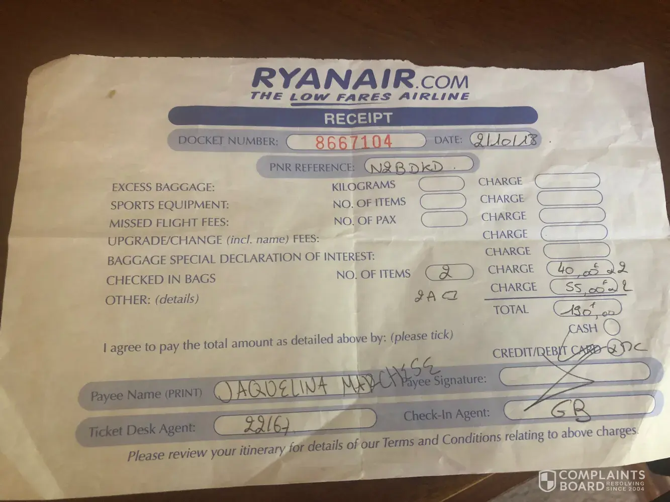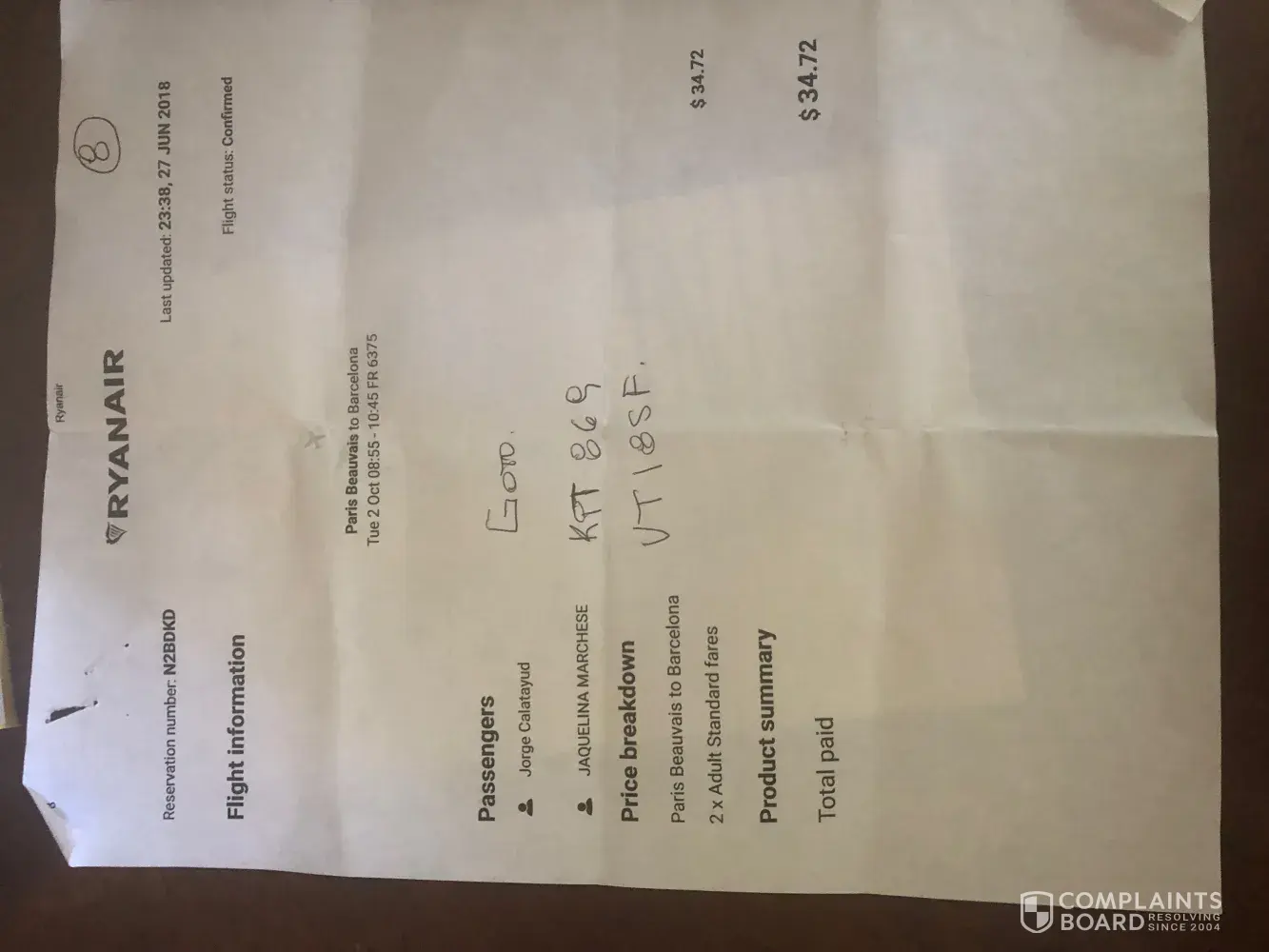 Soy Jaquelina Marchese les estoy pidiendo un reembolso que tuve que pagar en el aeropuerto de Paris Beauvais con numero de reserva N2BDKD hacia Barcelona el dia 2 de octubre por dos pasajeros, el mio propio y Jorge Calatayud por un total de 190 Euros por equipaje y checking en ventanilla.