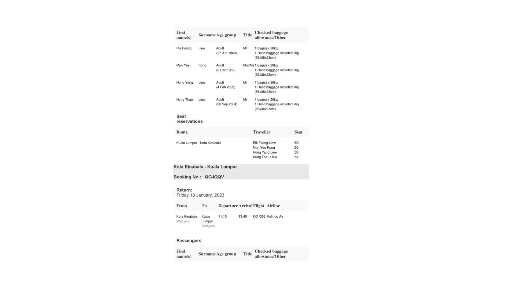 Fully paid 4 pax flight tickets and seat selection online from Kuala Lumpur (KL) to Kota Kinabalu (KK) on 9 Jan 2023 seats 5A to 5D and return flights from KK to KL on 13 Jan 2023 4A to 4D were non-existence and not performed. Fortunately, we checked in early and discovered the anomaly, and quickly seek help from the counter staff to book available seats then, for both trips. We were shocked to discover the non-performance and demand a full refund as contractual payment were not fulfilled.