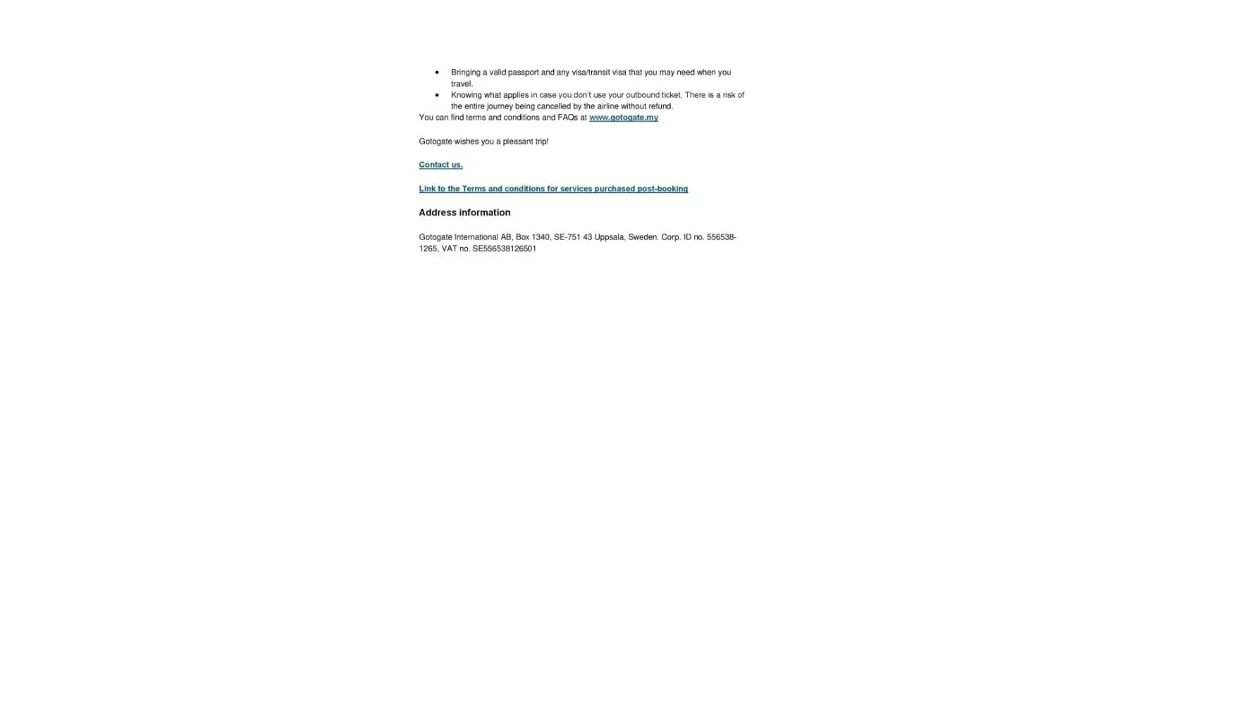 (Gotogate International AB, Box 1340, SE-751 43 Uppsala, Sweden. Corp. ID no. [protected], VAT no. SE556538126501)
