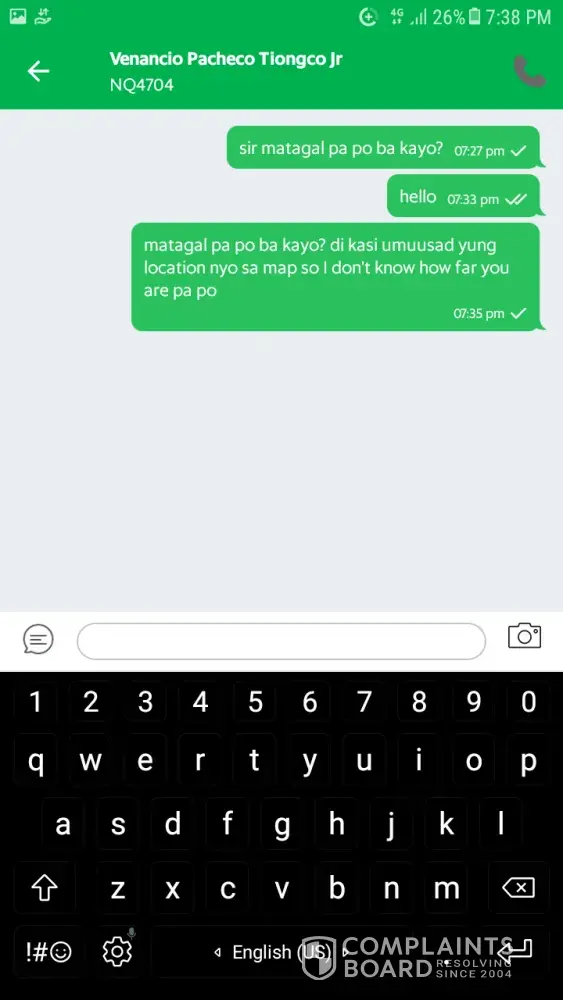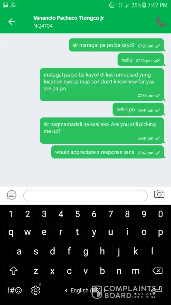 Vinencio Pacheco Tiongco Jr with a Red Mitsubishi Mirage Plate no NQ4704 accepted my booking at around 7:15pm. According to the app, he was to drop off a passenger first to a nearby area which was just a street away from my pick up point. After he dropped of his passenger, I saw his location in the app taking a different route. He was going the opposite way where I was. I tried contacting him at from 7:23 until 7:43. I didn't get a response. His location did not seem to move any further also.