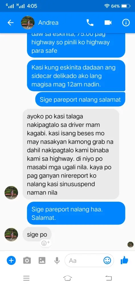 Complaint: My driver took a poor route. Nung nakasakay na kami tsaka niya lang sinabi na hindi siya sa coastal road dadaan sa C-5 ext. lang daw ang way niya dahil traffic daw at walang maibigay sa kanya na way yung app. Then nakiusap ako na baka pwede idaan sa coastal dahil 1 ako sa baba sa may Boundary ng Las Piñas at Bacoor sa may Longos, ang insist niya di daw pwede kesyo bawal daw magbaba ng paisa isa which is ako lang naman ang bababa at near na ako sa pintuan ng kotse para mabilis. Nung patuloy padin ako sa pakikipag-usap dinaan niya kami sa malubak na daan tapos biglang preno na alam ko namang nananadya. Nakakainis lang na isipin kaya nga nag Grab para convenient ang byahe pero sa experience ko hindi niya deserved mag service ng ganyan. Binaba niya kami sa destination namin ako lang ang naiba dahil dun ako dumaan sa delikadong way at napamahal pa ako sa sidecar imbis na sa mismog Longos na ako binaba. Wala namang pinagkaiba kasi expressway din yun. Isa pa nung nalaman niya na pito kami ginawang 1, 000 from 705. na sinabi niya. Paki aksyunan naman dahil alam naman natin na hindi tama ang inasal ng Grab Driver na yan. Maraming salamat sa inyong tulong at kooperasyon. Kung pwede po malaman kung naaksyunan ang aking complain, sa email ko ([protected]@gmail.com) or tawagan sa number na to [protected]). Salamat More power God bless!