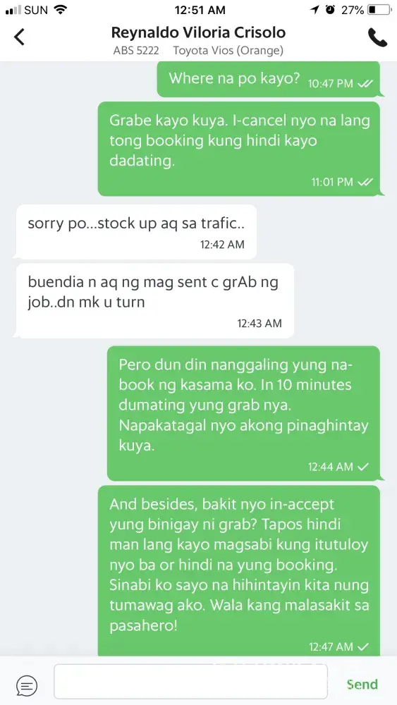 I cancelled a grab booking before there was any driver willing to accept my request. It was cancelled 11:42 pm. I took a taxi instead because rhe rain was pouring heavily. While on the taxi i received a message that driver is on the way at 11:45 pm. I cancelled at 11:42 pm so why did grab continue? Then the driver started sending cursing sms text messages via grab's sms txt messaging. You can check the screen shot photos attached. I jope grab has the anility to discipline this kind of driver. There were times that drivers cancelled my bookings too but i did not send them bad messages.