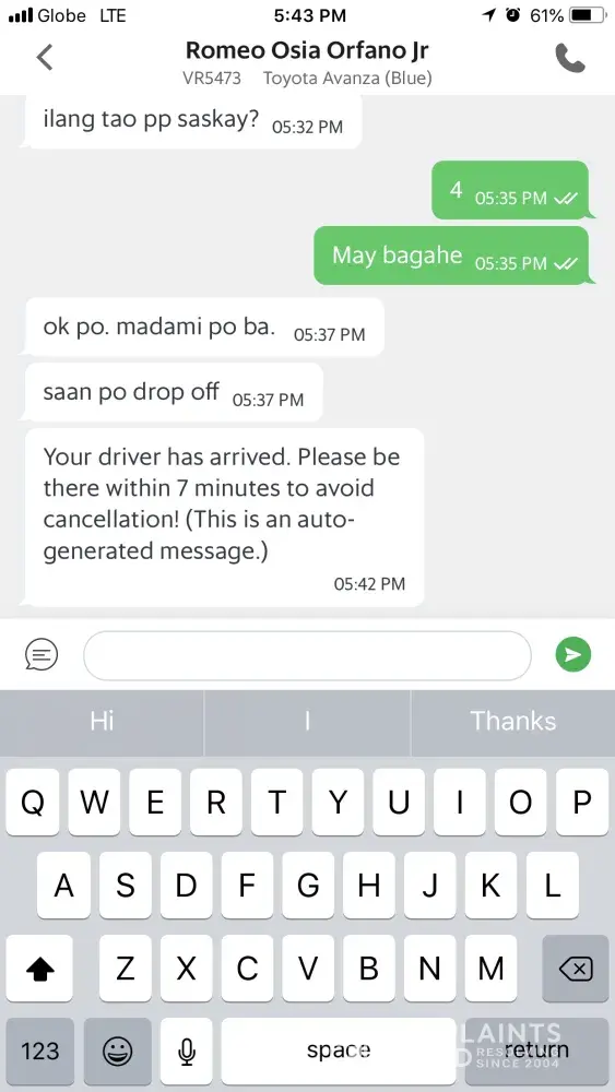 Romeo Osia Orfano Jr driving a blue Toyota Avanza with plate # VR5473 accepted our booking from naia 4 to Tondo. It was a 3 mins distance. Then he started texting me "ilan ang sasakay", " madami ba bagahe". When I called him, he asked me where is the drop off point. Finally when we got inside, he told us that he will drop us sa labas if masikip sa amin. I told him that he was the only grab driver who said that. And besides he accepted my booking so he must drop us where I pin my drop off pt. and for pete's sake it was raining. While inside the car, he was trying to intimidate us by talking to someone else..