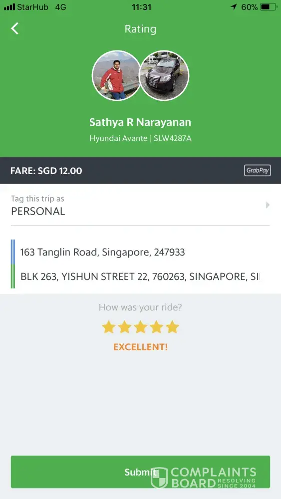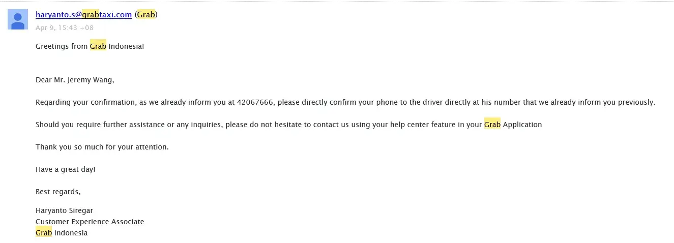 Should you need further assistance, we strongly recommend you to try our latest feature which is Grab Help Centre, it will be more efficient and provide a faster responses to any inquiries or complaints from you by our professional Customer Experience team.