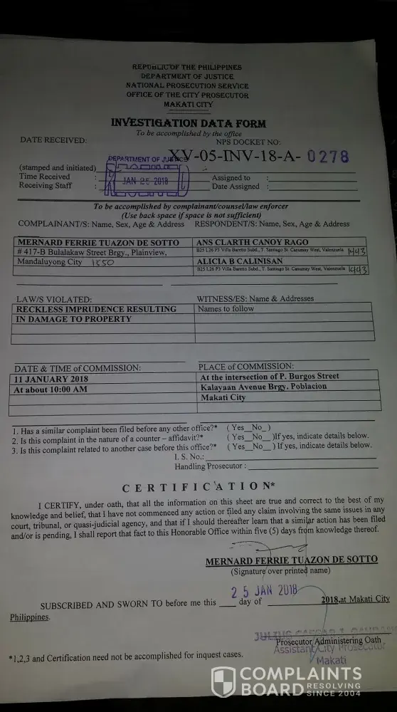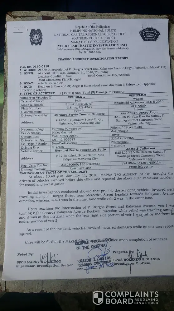 This is to bring to your notice that my car has been damaged by a grab driver Ans Clarth Rago/Plate # ABS 9689, we had an accident last Jan. 11, 2018, he bump my right rear bumper. The incident happened in Makati. I tried to contact him to follow on the repair however, he keeps giving me false hopes, and last Jan. 25, 2018, I already filed a case against him and I'm still waiting for the subpoena and the schedule of the hearing. May I request to shut off his Grab service for the mean time until the case is done. I attached all the documents you might need. Hoping for your fast response.