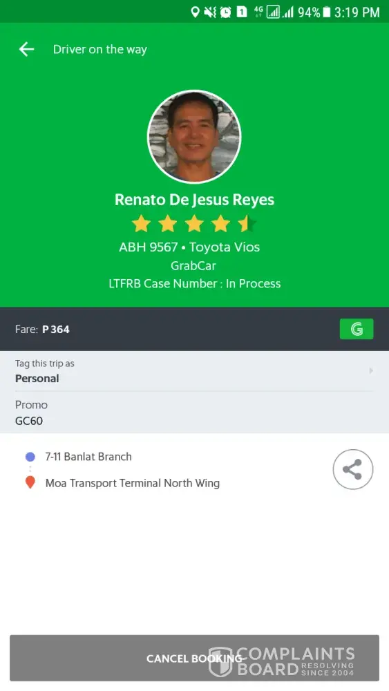 GRAB Driver: Arvin De Guzman of Toyota Vios ABR 3043 accepted my booking for a friend From Manila To Southwoods. He then sent a text asking for us to pay x2 of the original fare because accdg. to him he will have a hard time finding passengers in Southwoods. So, we declined his proposition and asked him to cancel the trip but he doesn't want to. He's insisting that I should cancel it because he needs to call GRAB before he can cancel — which is absurd! I dont want to cancel because it will affect my cancellation rate. I was polite with him initially but he is just unbelievable. He is even telling me that it is GRAB's policy that if the booking is outside manila the fare should be x2. Is that true? If it is then why we (the riders) didn't receive that announcement for us to be aware? This Grab Driver is just merely unbelievable!