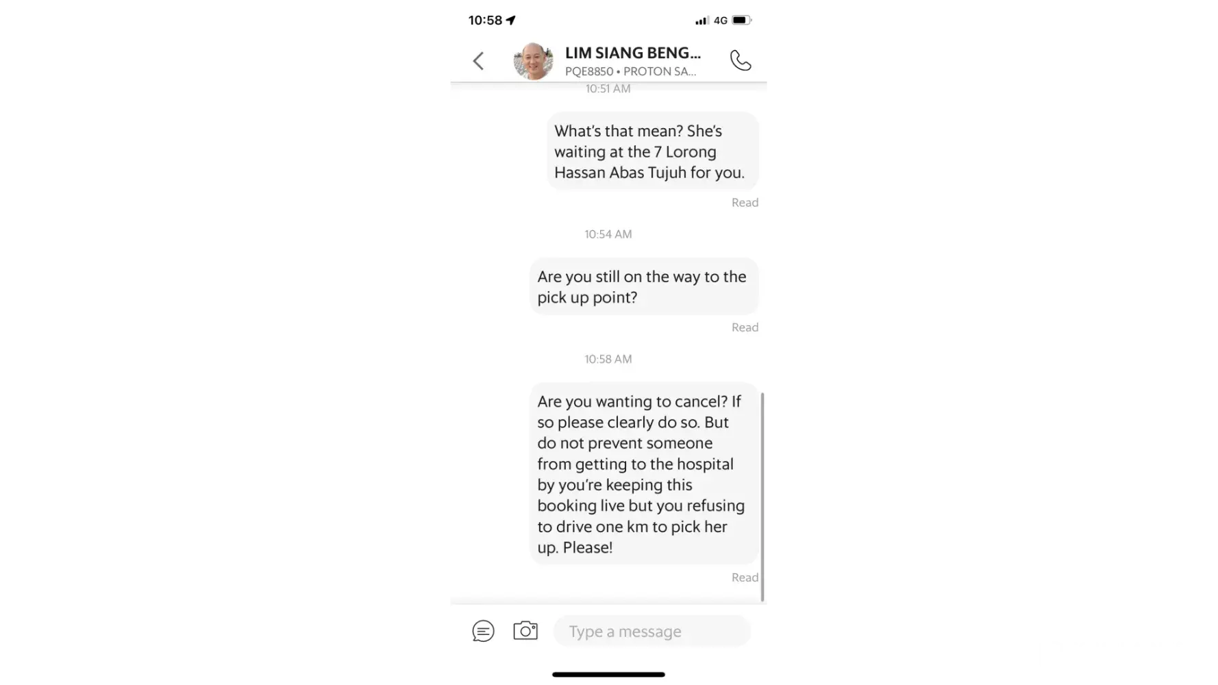 Finally she had to cancel and consider walking to a bus stop. I remotely ordered a Grab car to pick her up. A driver very near to my wife's location almost immediately accepted the job and my wife prepared to go with him. But after many minutes he too had not moved. He WOULD NOT CANCEL, but sent a cryptic message merely saying, "Sorry, below cost." What was that supposed to mean? I didn't know. So, I inquired. After more time and repeated message with the Grab driver not canceling, he said, "Yes, try another driver." See attached screenshots of the message exchange below. This feels very much like customer betrayal.