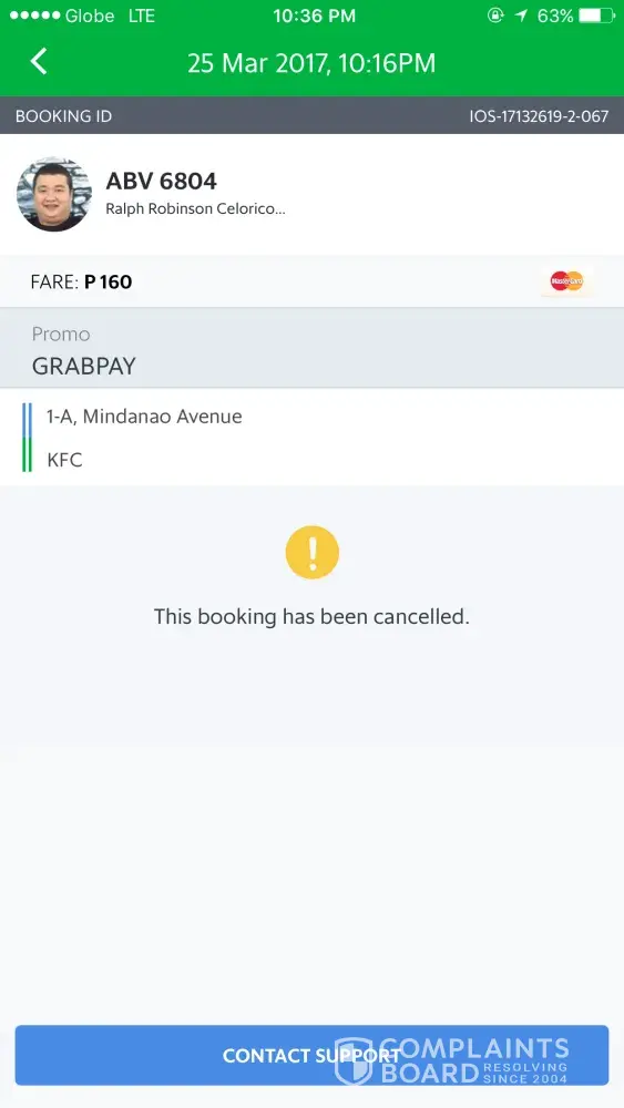 March 25, 2017 around 10pm. We were from trinoma contis mindanao area when we booked a grabcar to kfc matalino. I texted the driver that we were in contis/ucc area. He replied and asked where is specifically contis is located. I emphasized again our location, however he replied that he is in mcdo area which is few meters away from contis lang and he asked me the same question so i decided to call him, i even greet him good evening and told him nicely where i was standing. When he knew that we were in trinoma contis area, he was mad because didn't place the exact location on the booking. Okay, provided that i was wrong in entering the location (pero same street), is it enough to raise his voice on me and be mad because nka u turn na daw xa? He wasso bastos! The tone of his voice is so unprofessional. He was not mad as he claimed but he raised his voice! I've been on grabcar for sometime since drivers are kind and i really liked the service and this is my first time to cancel the trip and i am so disappointed with the way he acted, disrespectful and unprofessional. And by the way, he charged the amount on my credit card even if i cancelled the trip. Hopeing for your actuon on this.thank u.
