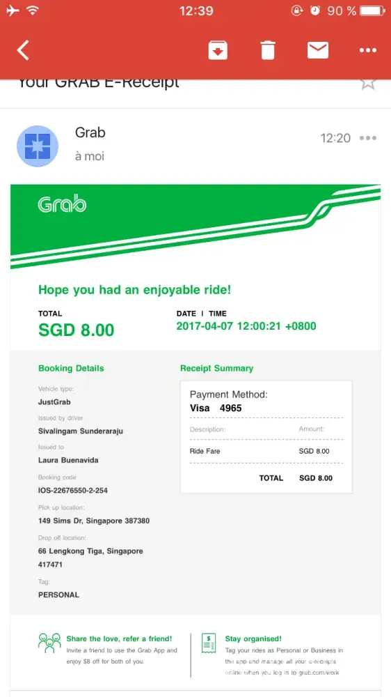 I am very disappointed with Grab's services and how Grab e-receipt. When I took Grab taxi in Indonesia and Thailand I did not receive any email on the e-receipt. For Indonesia I wrote in, the customer service told me to get the e-receipt on the server. Ok fine I got it.