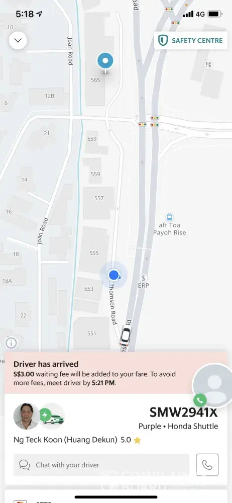 Then I sent the Grab driver a special message that I'm waiting at Sing298140, 555 Thomson Rd. The driver didn't seem to read my message.