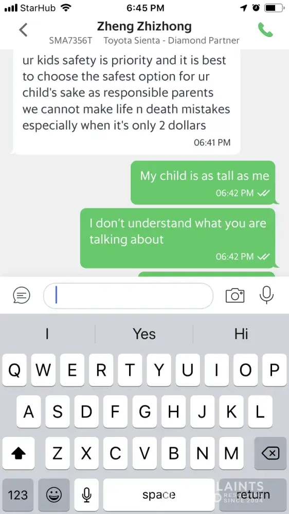 Driver was refusing to take me and my 14-year-old daughter insisting that we get a Grab family instead of a Grab car because of her being a kid. Insisting because taking a 14-year-old would be against Singapore law. He would not cancel and it is now five minutes before my dr appointment that will cost me $250. I am very very late. I am in tears I'm so upset.